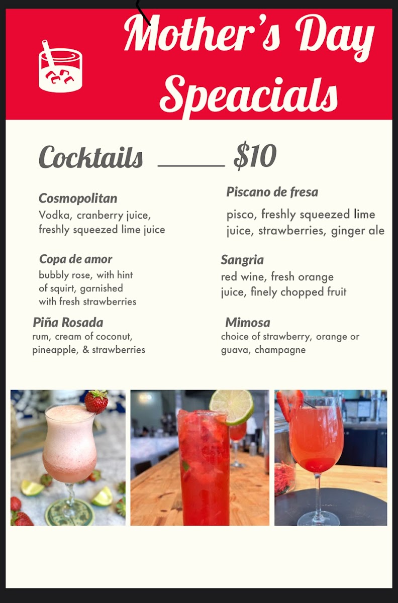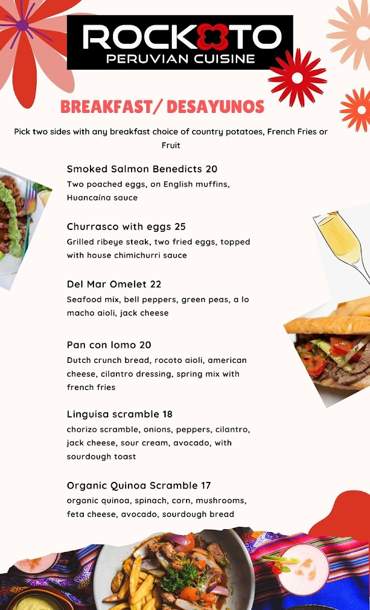 The menu at Rockoto Peruvian Cuisine offers a variety of traditional Peruvian dishes and beverages, organized into several key categories. Visitors can find a selection of entrées featuring both meat and seafood options, including dishes like Pan Con Chicharrón, Salmon A Lo Macho, and Churrasco Criollo. These main courses often include complementary sides such as rice, roasted potatoes, or house salads.